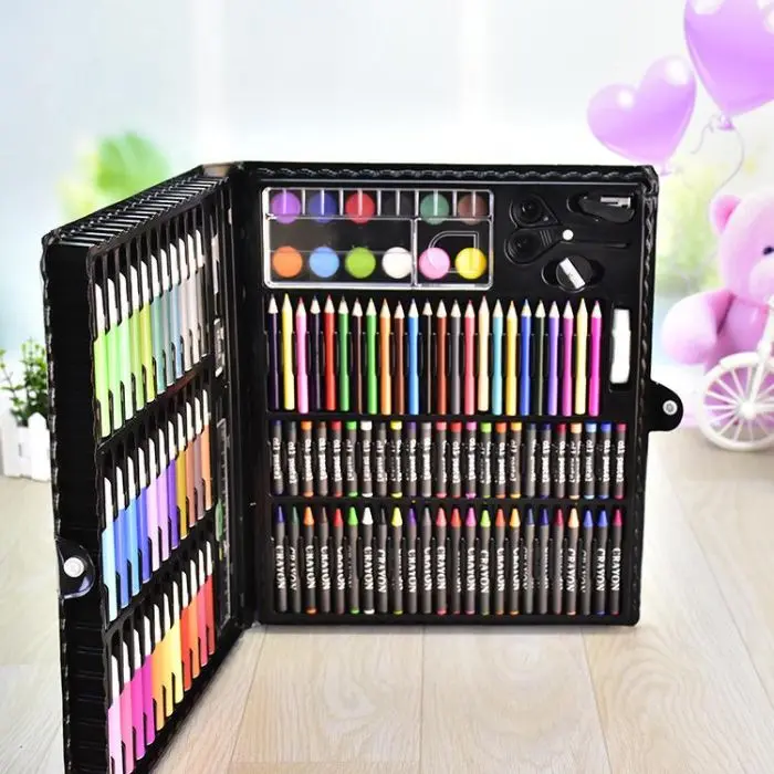 Valija set artistico 150 pcs36 marcadores -24 cryones de cera24 pasteles -24 lapices -20 clips12 acuarelas -1 pincel -1 paleta -1 abrochadora -1 tijera -1 esponja -1 sacapuntas1 pegamento -1 regla -goma de borrar -1 lapiz -1 estuche con manija