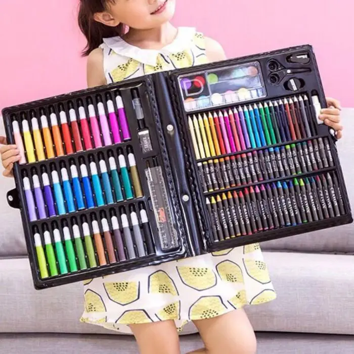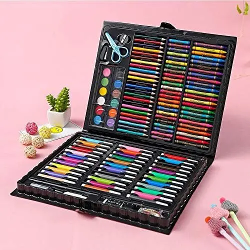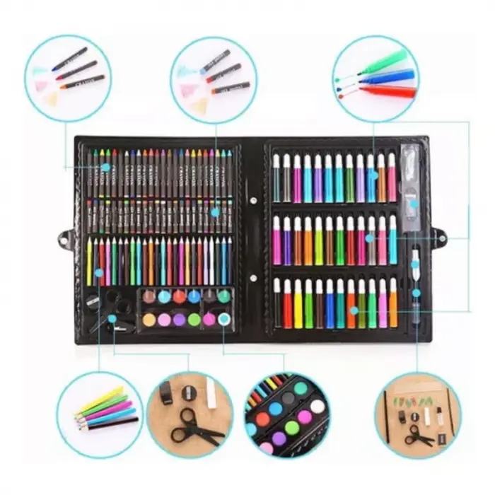 Valija set artistico 150 pcs36 marcadores -24 cryones de cera24 pasteles -24 lapices -20 clips12 acuarelas -1 pincel -1 paleta -1 abrochadora -1 tijera -1 esponja -1 sacapuntas1 pegamento -1 regla -goma de borrar -1 lapiz -1 estuche con manija